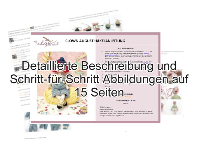 Du bist ein Fan von Clowns oder suchst einfach nach etwas zum Verschenken oder Schmücken zum Fasching? Dann könnte diese Häkelclown Anleitung genau das richtige für dich sein. Die Häkelanleitung beinhaltet detaillierte Beschreibungen und viele Schritt-für-Schritt Abbildungen auf 15 Seiten, damit dein eigener Clown einfach gelingt. Der Häkelclown ist 17,5 cm hoch und hat viele schöne Details wie z.B. eine Blume, eine Melone, eine kleine Spange, Hosentaschen ...