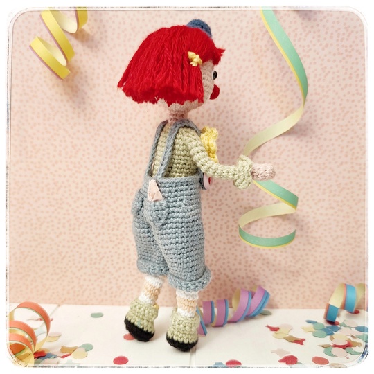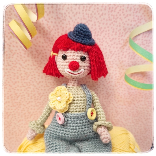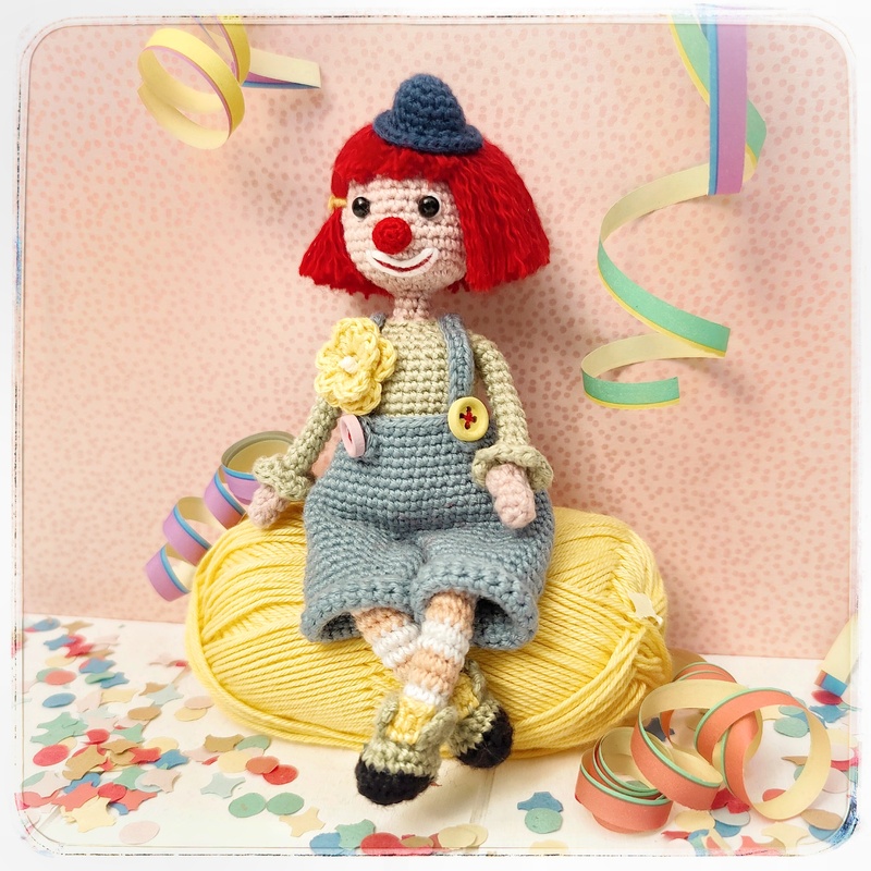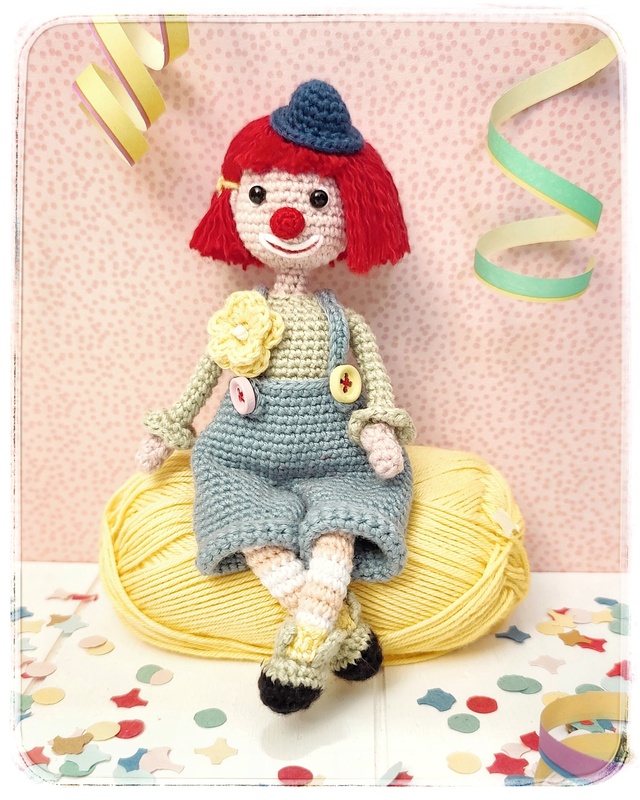 Mit Garn der Kategorie super fine (10 x 10 cm = 27 sts x 38 rows) wird der Clown ca. 17,5 cm groß.
