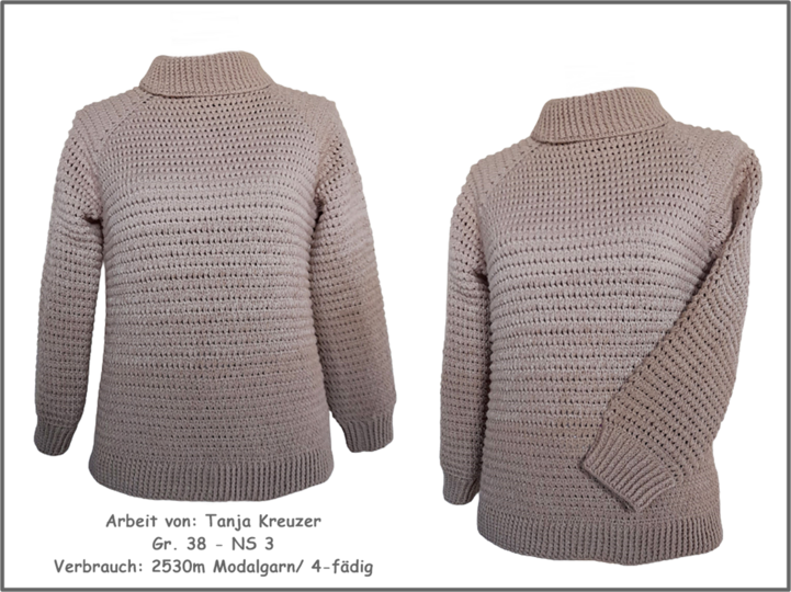 Für jede weitere Doppelgröße (40/42 – 44/46.....) sollte man ca. 200m mehr Garn einplanen. Weitere Verbräuche siehe Bilder