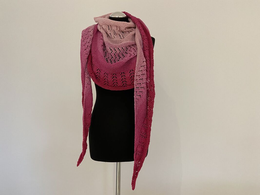 Das Tuch ist kein klassisches Dreieckstuch. Durch den geraden, mittleren Abschnitt entsteht eine besonders flache Form, die es vielseitig tragbar macht – ob locker um die Schultern gelegt oder schmal als Schal gewickelt.