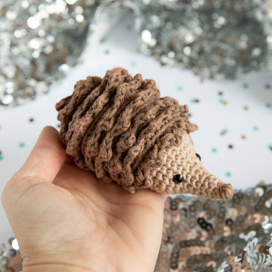 Die kleine Igeldame häkelst du mit einer Nadelstärke von 3mm. Und Garn in der Stärke 3-4mm. Sie wird mit einer 3mm Nadel und dem angegebenen Garn 11x6cm groß.