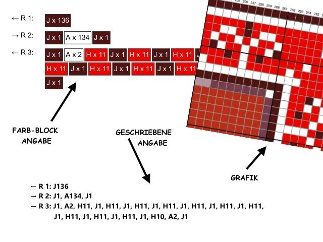 -farbige Zahlen-Blöcke für jede Reihe für feste Maschen (Stb od. hStb)