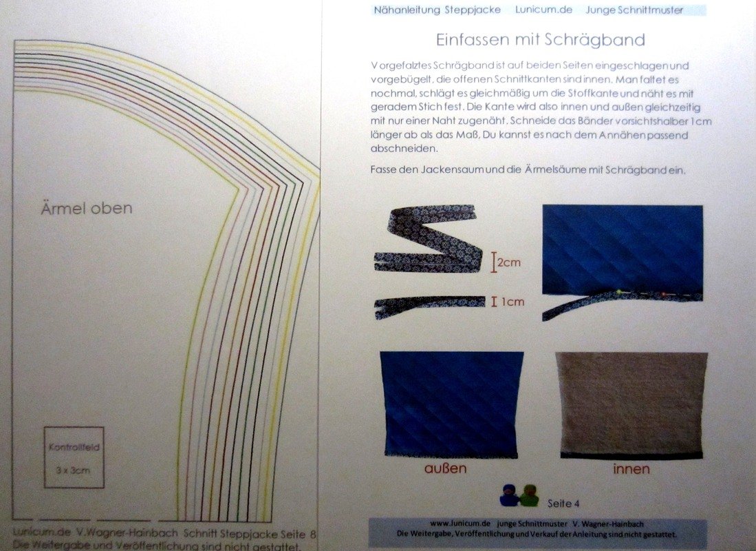 Schnittmuster für eine schlichte Kinder-Steppjacke mit Hemdkragen und Reißverschluss. Die Jacke hat keine Seitennaht, das ist weich und spart Zeit. Die Kanten werden teilweise mit vorgefalztem Baumwollschrägband eingefasst, eine einfache und dünne Verarbeitung für dickere Stoffe. Für dieses Modell verwendet man einen Wendestoff, bei dem beide Seiten schön sind, wie z.B. doppellagigen Steppstoff. Für das Musterteil habe ich Steppstoff mit leichtem Teddyflausch auf der Rückseite verwendet, das hat nochmal einen schönen Effekt beim Kragen, der aus der Wendeseite genäht ist. Den Reißverschluss können Sie bei diesem Modell selber kürzen, weil das obere Ende mit in den Kragen genäht wird. Alternativ kann man teilbare Reißverschlüsse in der genau passenden Länge bestellen, z.B. bei Werner Nähbedarf. Die Kombination aus Außenseite und Innenseite mit dem Schrägband ermöglicht eine kreative Farbkombination.