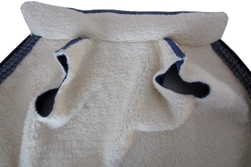 Wendestoff, z.B. Steppstoff mit Stoff innen und außen und einer leichten Watteschicht. Das Musterteil hat einen Steppstoff mit Teddy-Innenseite. Teilbarer Reißverschluss, Schrägband.