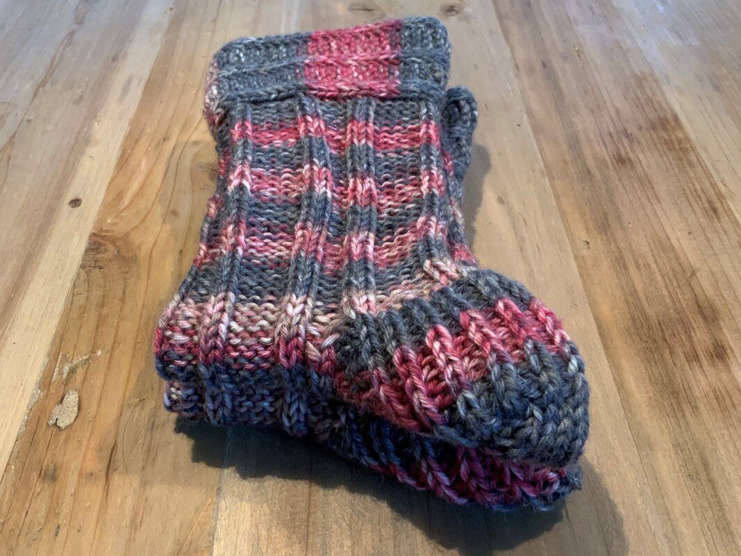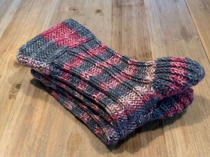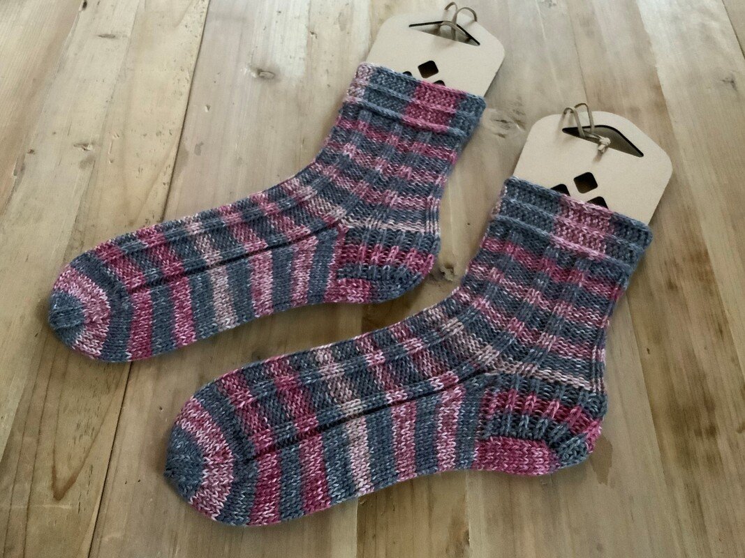 „Bibiane“, aus 6-fach Sockenwolle, gerippt, gestreift und mal mit einem ganz anderen Bündchen. Das Bündchen wird in Reihen gestrickt, dann zur Runde zusammengenäht. Dann werden aus dem Rand die Maschen für den Schaft aufgenommen. Die Socken werden von oben nach unten gestrickt. Die Grundlagen des Sockenstrickens sollten bekannt sein. Ich habe die Ferse als klassische Ferse (mit Halbpatent) gearbeitet und eine Bandspitze gestrickt und beschrieben. Ferse und auch Spitze können jedoch auch anders ausgeführt werden.