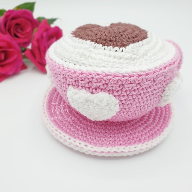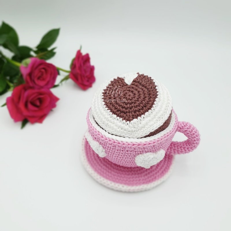 Hier ist eine leichte verständlichen Häkelanleitung für die heiße Kakaotasse mit Herz | Herz-Tasse zum Valentinstag mit Kakao Herz Latte Art.