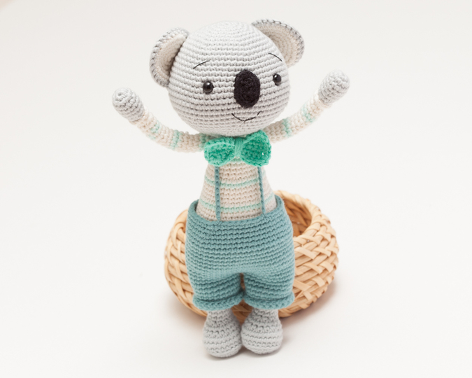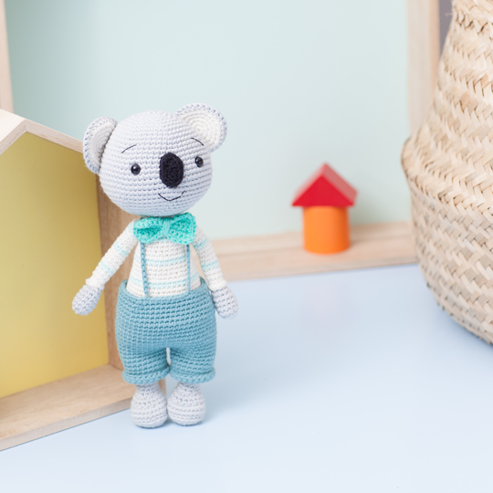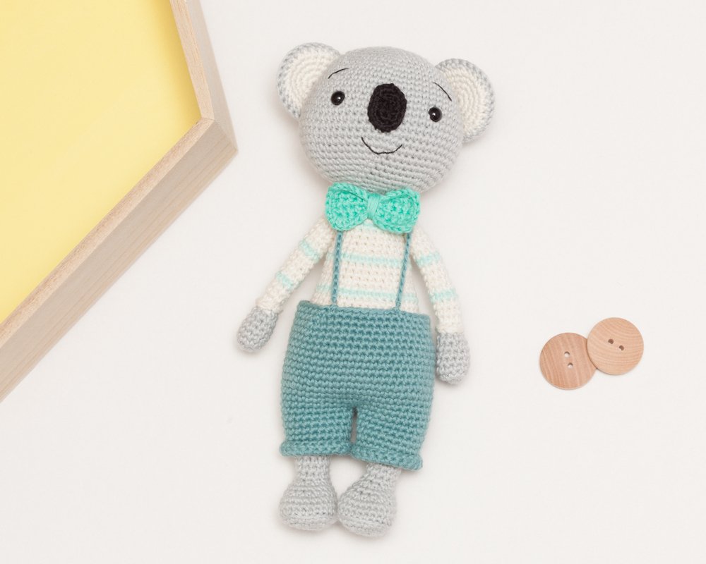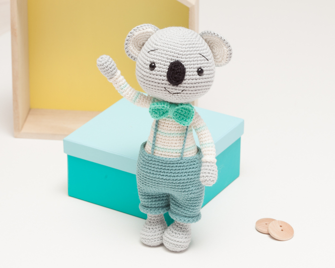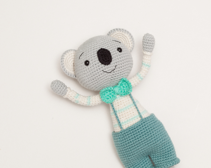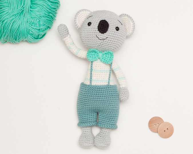 Wenn Du dasselbe Garn und dieselbe Häkelnadel verwendest wie angegeben, wird der kleine ca. Koala 19,5 cm (7,6 Zoll) groß. Du kannst es größer oder kleiner machen, indem du ein anderes Garn benutzt. Passe aber dann die Häkelnadel und die Sicherheitsaugen entsprechend an.
