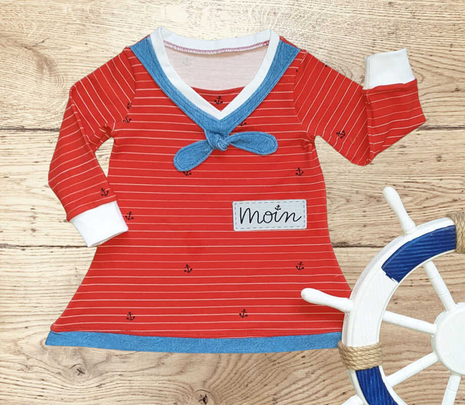 Ein Schnitt mit V-Ausschnitt, Bündchen, in A-Linie und mit dem typischen Matrosenknoten, den du am Halsausschnitt mit einnähen kannst.