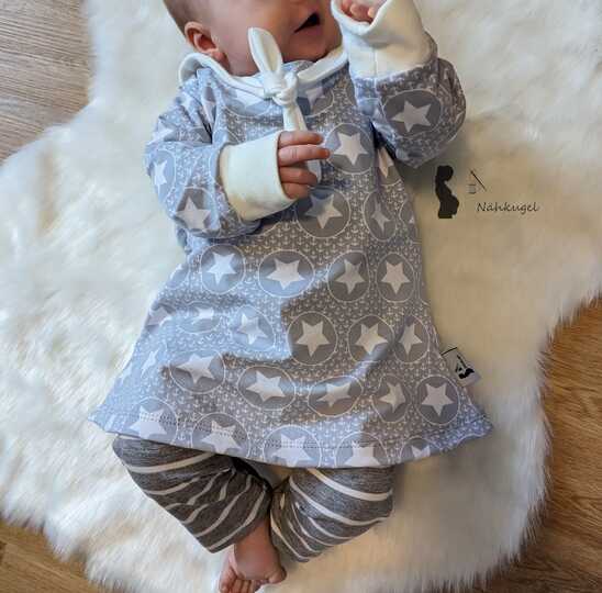 Gr. 62 – 92 umfasst der Schnitt, den du vorzugsweise aus Jersey, aber auch aus gut dehnbarem Sommersweat nähen kannst.
