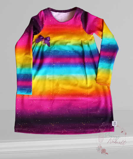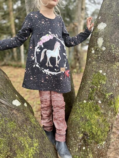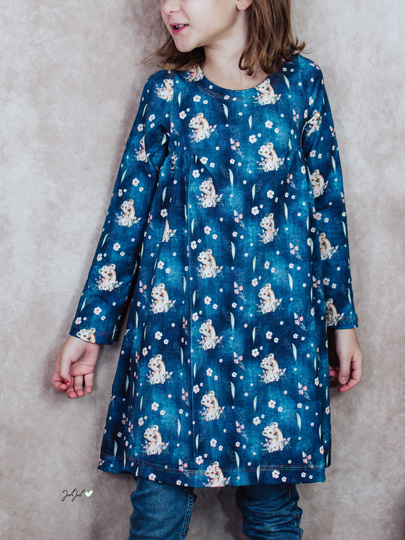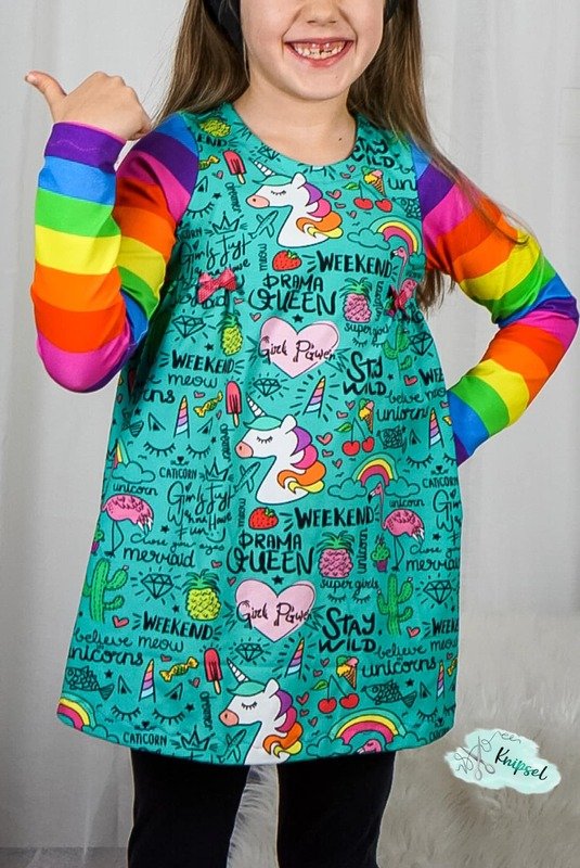 Du kannst lange oder kurze Ärmel auswählen und hast so ein Schnittmuster fürs ganze Jahr. Gr. 104 – 164 umfasst der Schnitt in Einzelgrößen in 2 Längen: eine Tunikalänge oder ein knielanges Kleid.