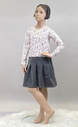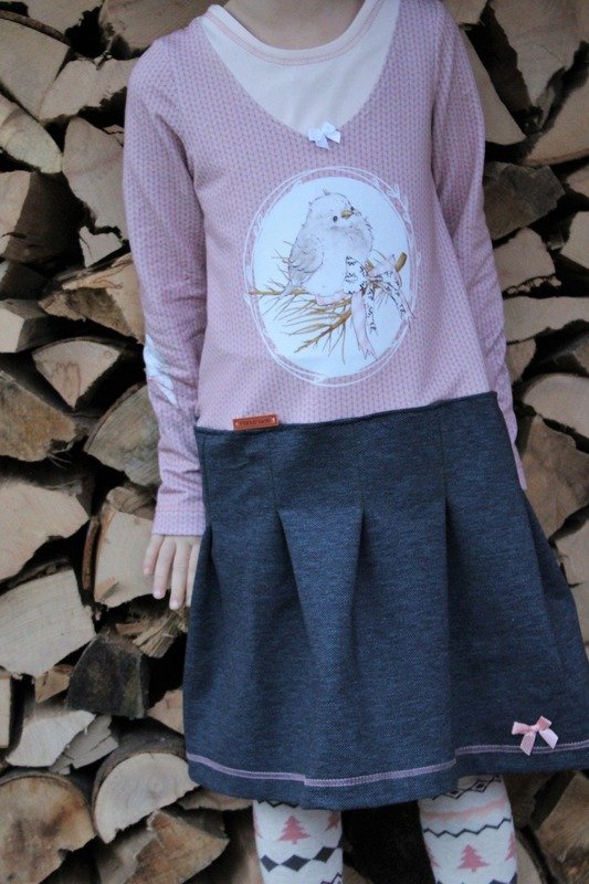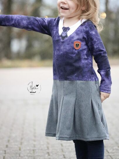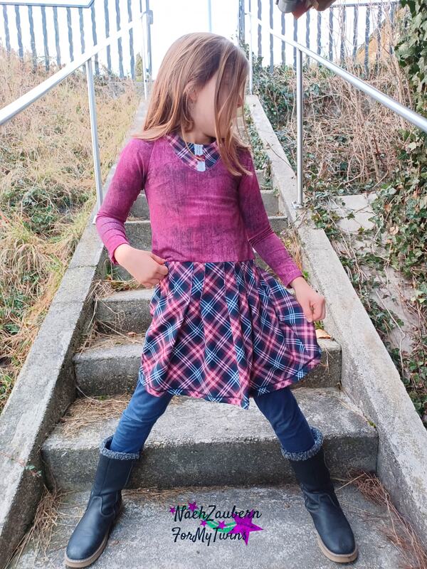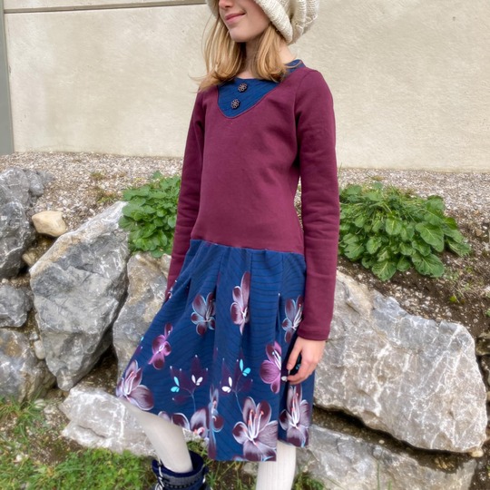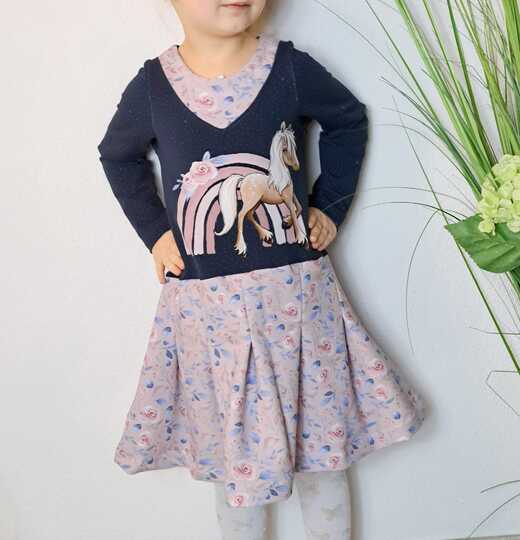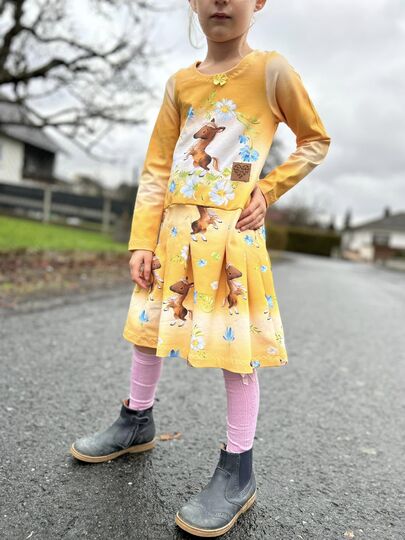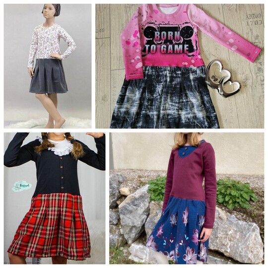 Nähbar in Gr. 104 – 164 jeweils in Einzelgrößen – das Oberteil idealerweise aus Jersey oder gut dehnbarem Sommersweat, den Rockteil kannst du ebenso aus Jersey oder Sweat nähen – aber auch aus Webware. Beim Rockteil hast du 2 Möglichkeiten: eine recht gerade Form an der Hüfte und eine ausladendere Variante in A-Linie.
