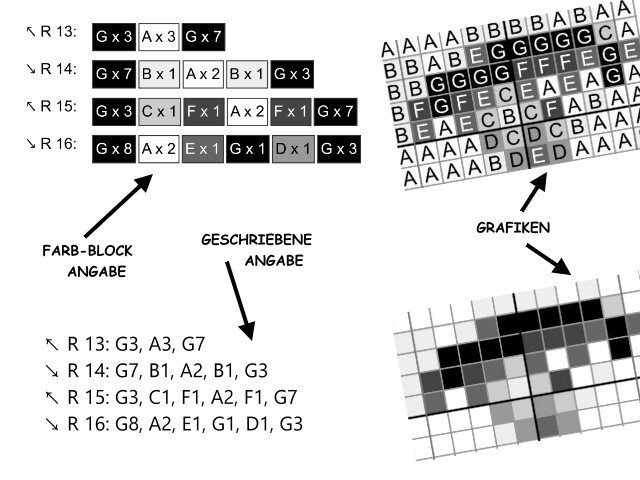 -farbige Zahlen-Blöcke für jede Zeile für C2C-Technik