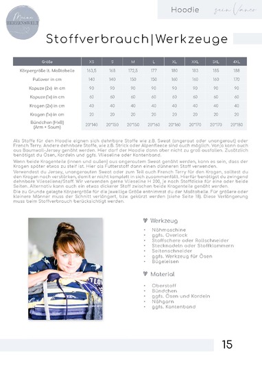 Für unseren Hoodie Vanco eignen sich etwas dickere, dehnbare Stoffe wie z.B. Sweat (angeraut oder unangeraut), French Terry, Strick, etc.. Auch dünnere Stoffe wie z.B. Jersey sind möglich. Zusätzlich benötigst du optional Bündchenware, Kordeln, Ösen, Vlieseline zur Verstärkung und Paspeln oder Ähnliches.