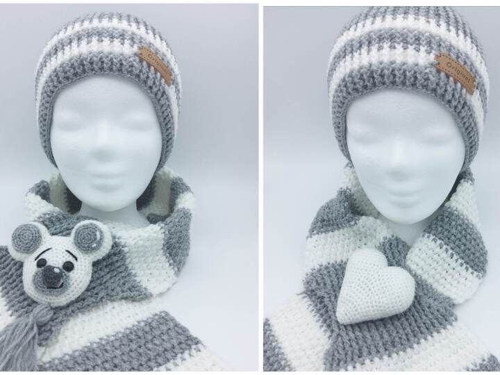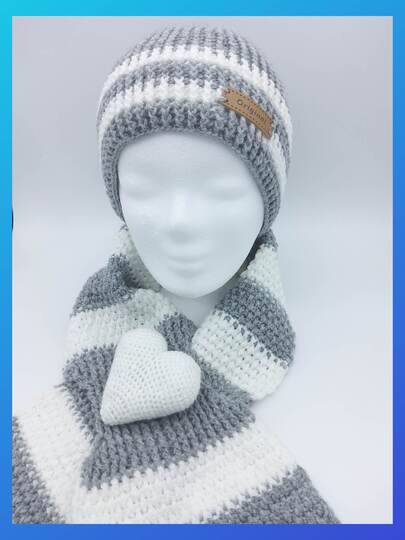 Dieses Set ist einfach und schnell gehäkelt. Der Schal ist mit zwei Verschlussvarianten, von denen du dir eine aussuchen kannst. Die Mütze ist in Einheitsgröße und passt sich durch die Reliefmaschen optimal am Kopf an.