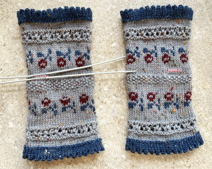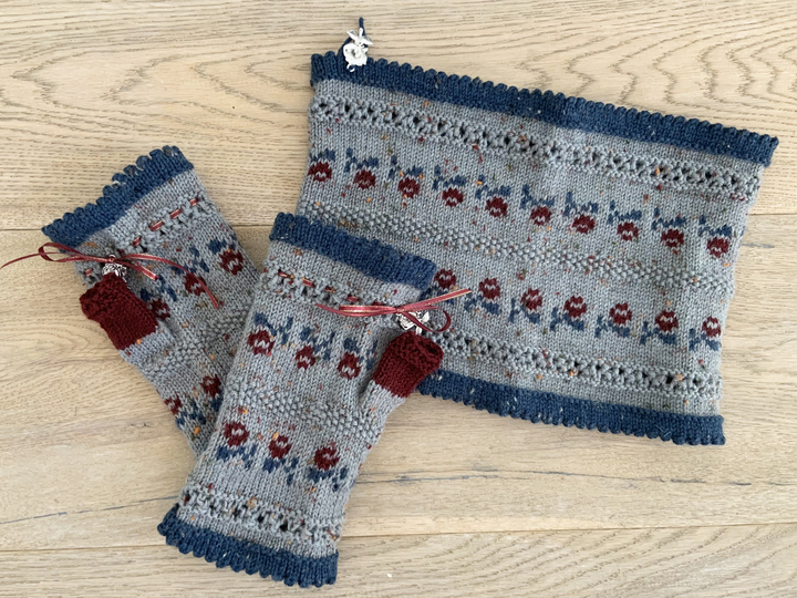 Diese Armstulpen, die eigentlich Handschuhe ohne Finger mit Daumen sind, wurden passend zu einem Loopschal im Trachtenstil gestrickt. Die Anleitung für diesen ist ebenfalls auf Crazypatterns zu haben (Angebot Nr. 88606).