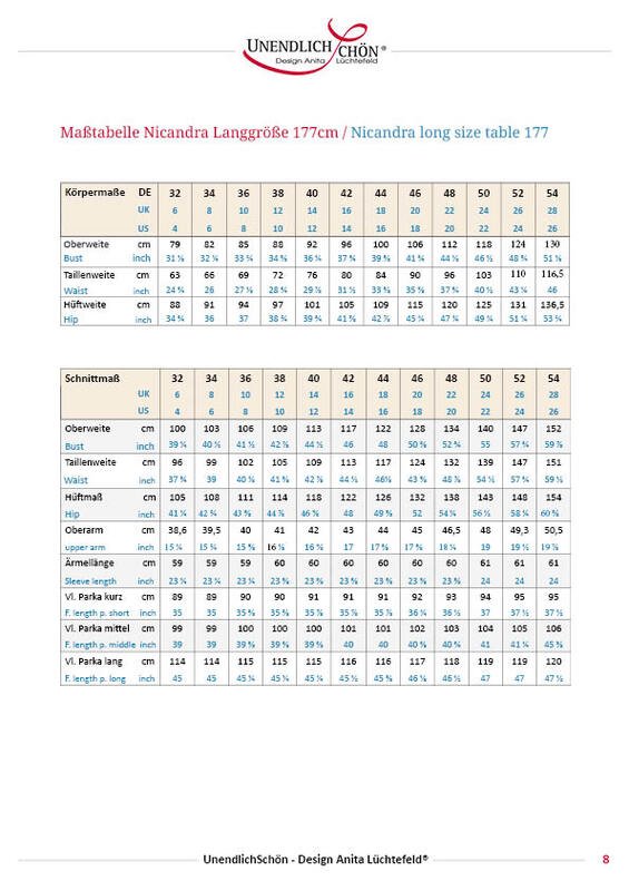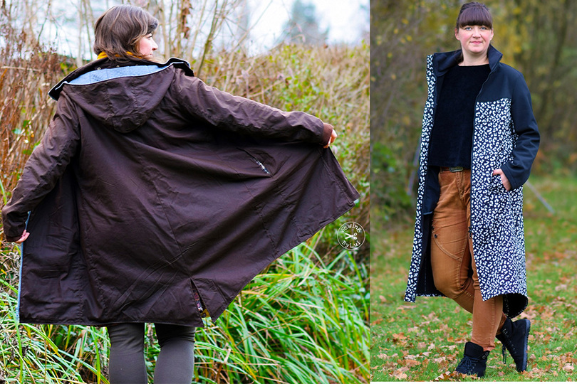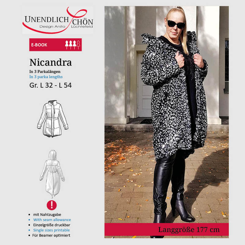 Nicandra ist ein ganzjährig tragbarer Parkaschnitt in der Länge 177 cm, der als Jacke, knielanger Parka oder langer Parka genäht werden kann. Ungefüttert ist er ein leichter Sommerparka, mit dünnem Innenfutter ist er für Frühjahr und Herbst geeignet.