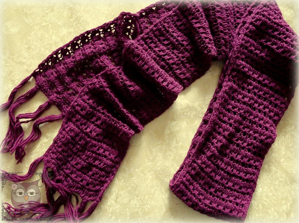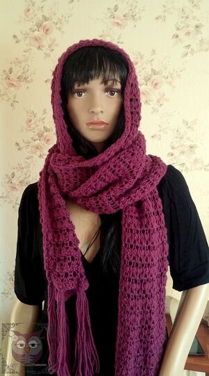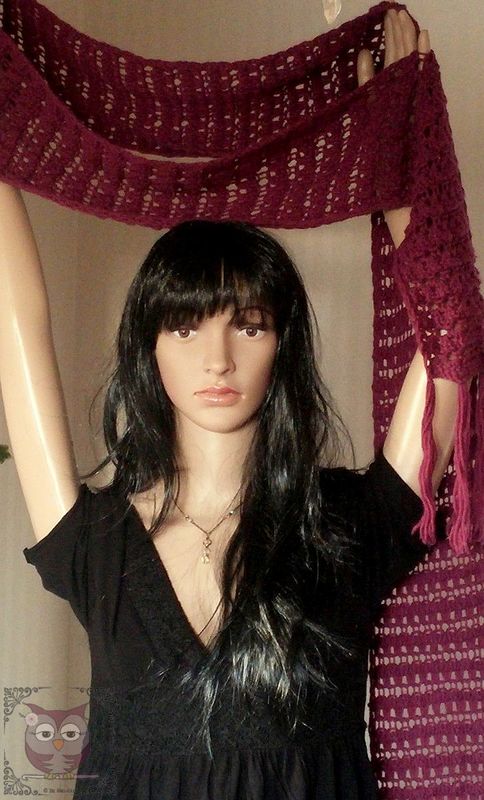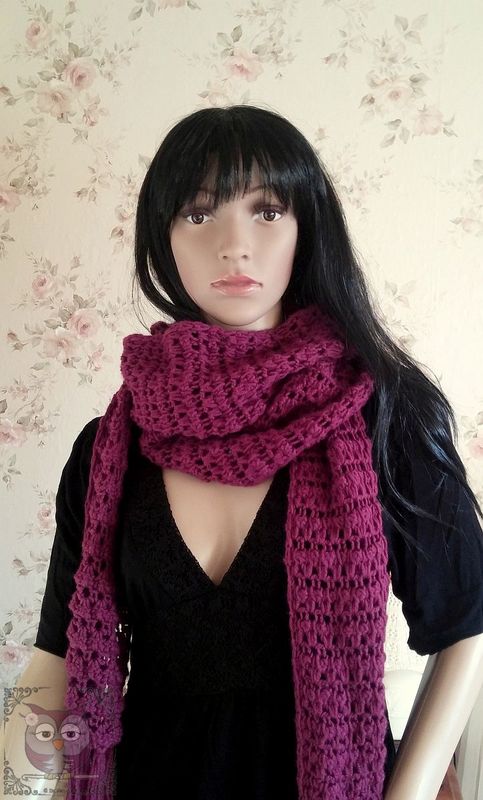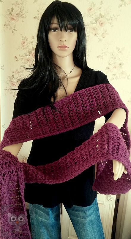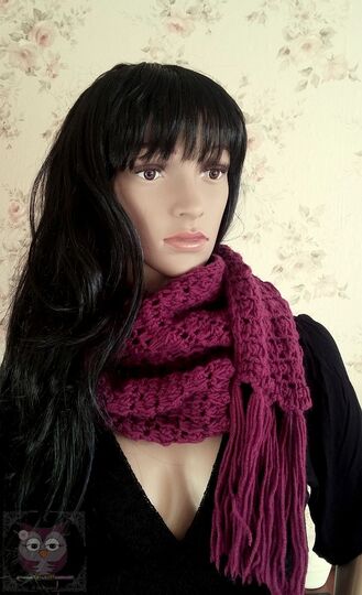 Der Häkelschal ist ca. 16cm breit und ca. 2,30m lang (o. Fransen). Man kann sich also schön warm darin einmummeln