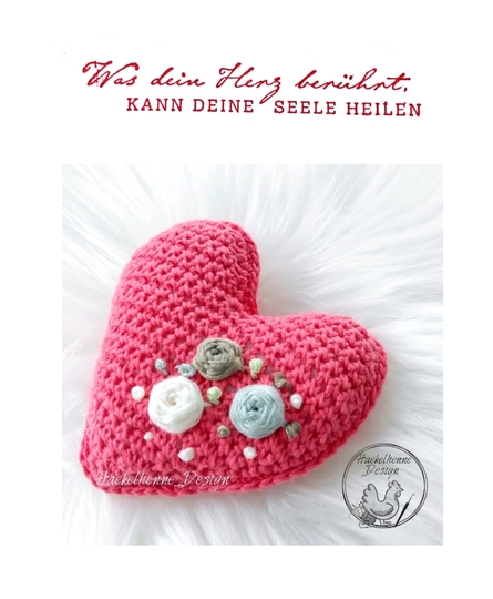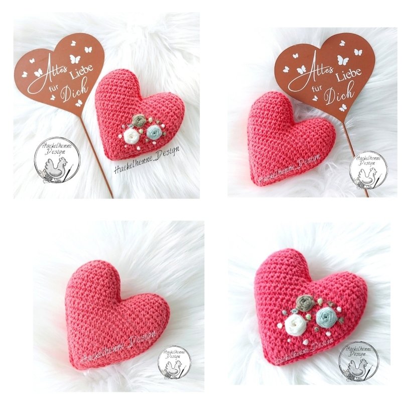 Du kannst das Herz sowie die Röschen in dieser Anleitung nacharbeiten. Es eignet sich besonders für Babyrasseln, als Duftherz z.B. mit Lavendel gefüllt, als schöne Dekoration oder auch um jemanden eine Freude zu bereiten. Ob als Aufhängung oder als Blumenstecker macht so ein hübsches Herz immer etwas her. Das Herz ist auch eine schöne Geschenkidee zum Muttertag. Durch die optimale Größe kann es auch als Ringkissen bei einer Hochzeit verwendet werden. Da das Herz aus 2 identischen Seiten hergestellt wird, kann es auch als Applikation genutzt werden.