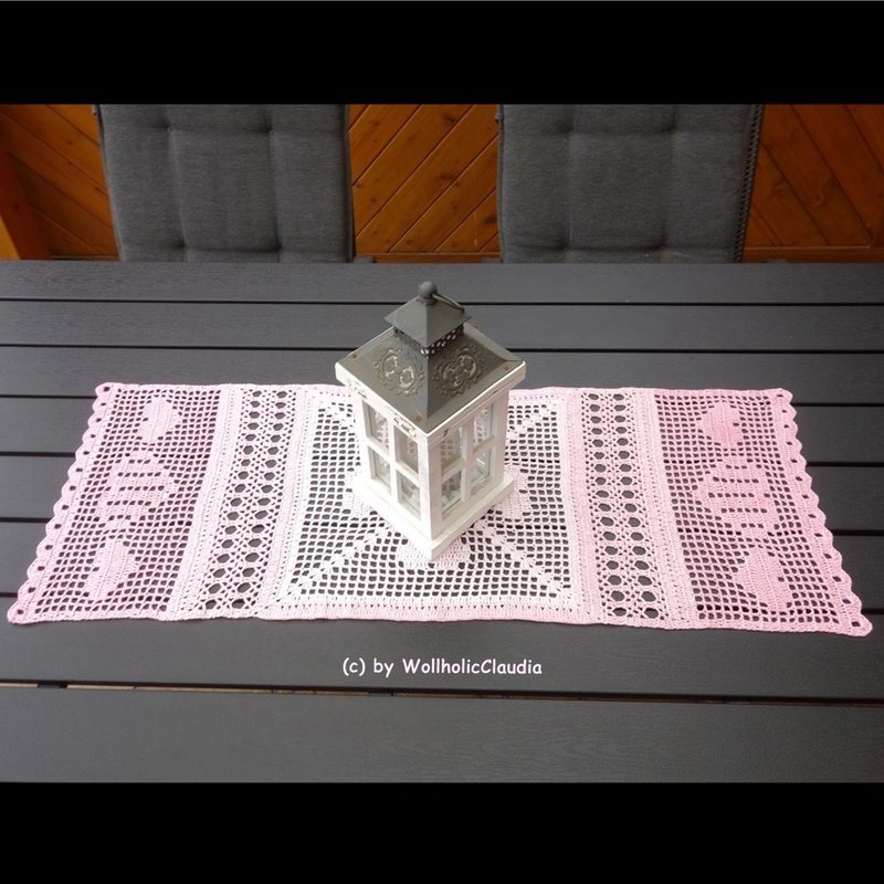 Dieser wunderschöne Läufer ist ein Mix aus Filethäkeln und dem herkömmlichen häkeln und macht nicht nur an Valentinstag oder Muttertag Freude.