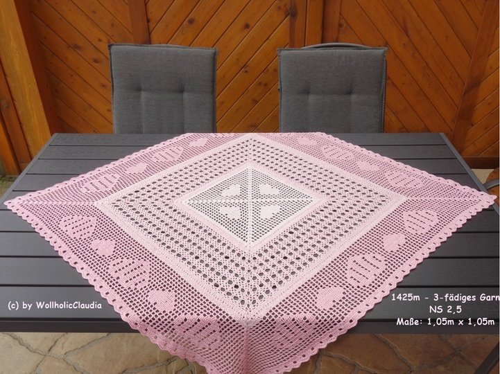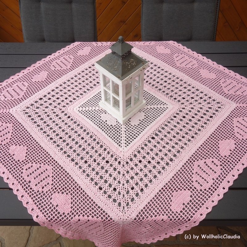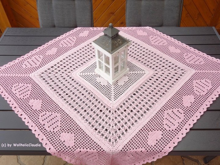 Diese wunderschöne Mitteldecke ist ein Mix aus Filethäkeln und dem herkömmlichen häkeln und macht nicht nur an Valentinstag oder Muttertag Freude.