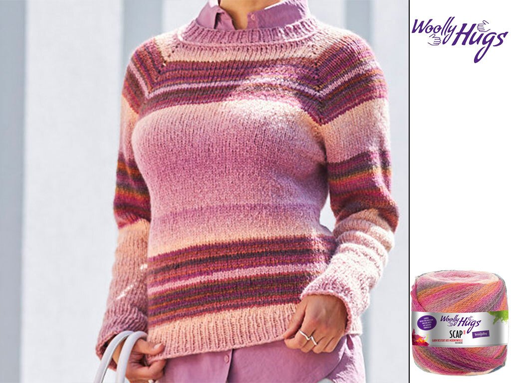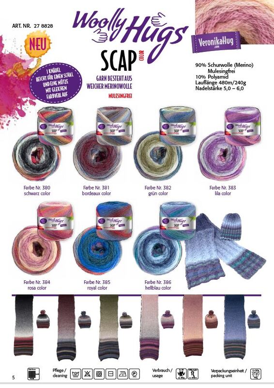 Was muss man machen um solche schönen harmonische Streifen zu bekommen? Nicht viel, man muss sich nur für die Woolly Hugs Scap entscheiden. Denn die ist besonders. Die Qualität SCAP heißt SCAP, weil die Menge auf einem Knäuel so berechnet ist, dass daraus ein Schal (SCARF) und eine Mütze (CAP) gearbeitet werden kann. Wer den Knäuel von außen abarbeitet, findet zunächst einen bunten Farbblock, dann einen langen Farbverlauf von hell nach dunkel und wieder von dunkel nach hell, denn den 2. bunten Farbblock (nach dem der Schal beendet werden kann) und anschließend noch einen 3. bunten Farbblock (der für eine Mütze ausreicht).