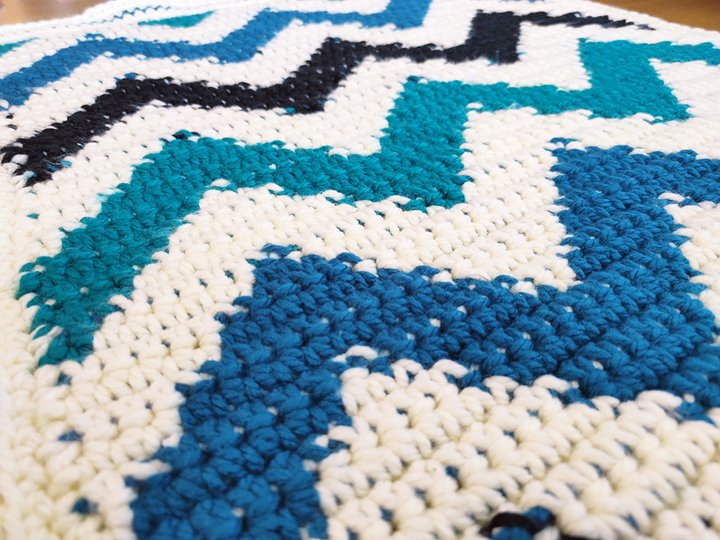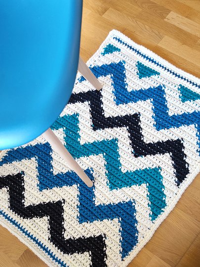 Dieser Teppich bringt Leben in Dein zu Hause. Das Muster im Scandi Design ist modern und dank der dicken Wolle ist der Teppich schnell gehäkelt.