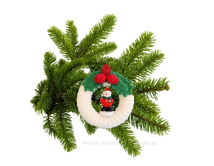 Die umfangreiche, reichlich bebilderte PDF-Häkelanleitung zum Häkeln von Tannenbaumschmuck "Kranz mit Beeren" zum Dekorieren des Tannenbaums oder als Mitbringsel für die Freunde. Den Kranz kann man auch als kleinen Türkranz benutzen.