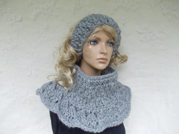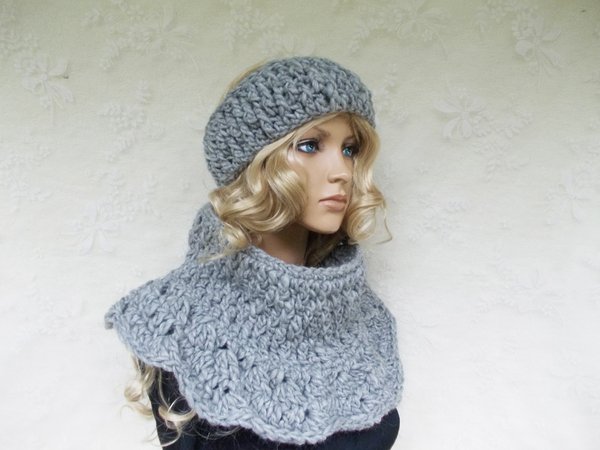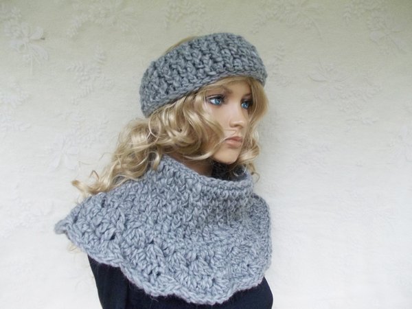 Auf einigen Bildern seht Ihr passend zu dem Stirnband einen Rundschal; die Anleitung hierfür gibt es auch in meinem Shop.