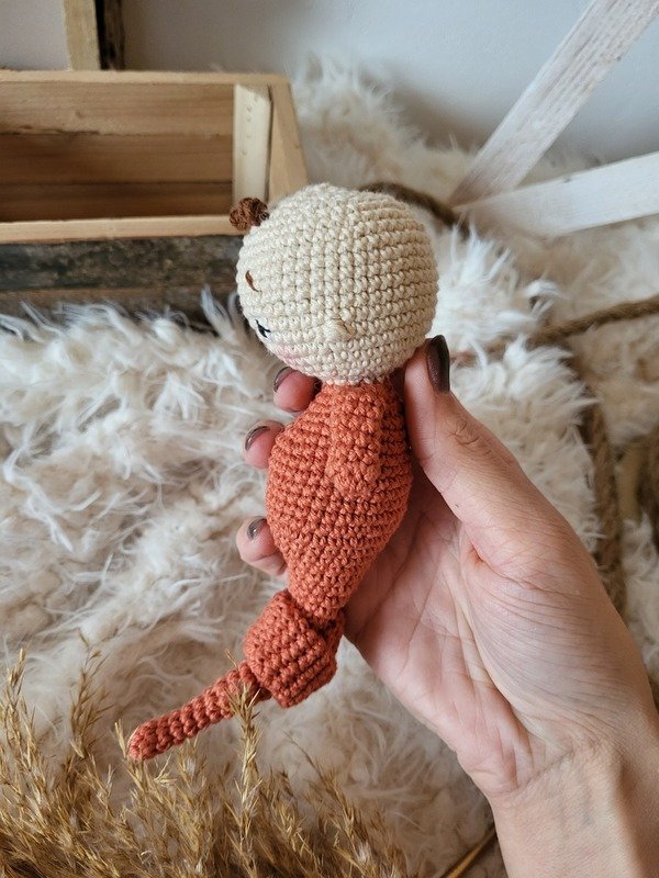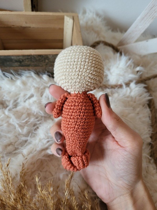 Das fertige Knotenbaby ist bei Verwendung von Wolle 50g/125m, ca. 18 cm groß.