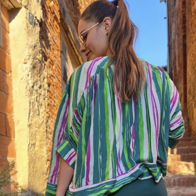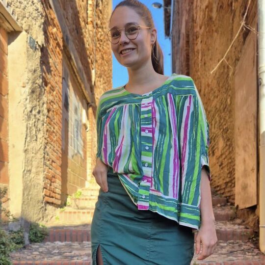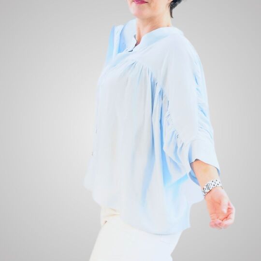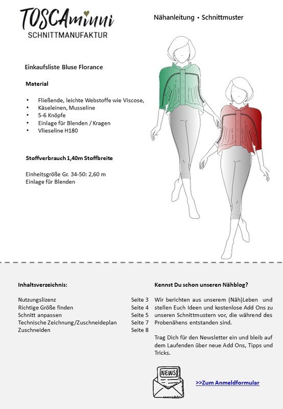 Mit dem Schnittmuster Florance nähst Du Dir eine luftig weit geschnittene Sommerbluse - die durch die gerafften Ärmel sehr raffiniert und elegant wirkt. Besonders schick dazu wirkt eine schmal geschnittene 3/4 Hose mit Sandaletten.
