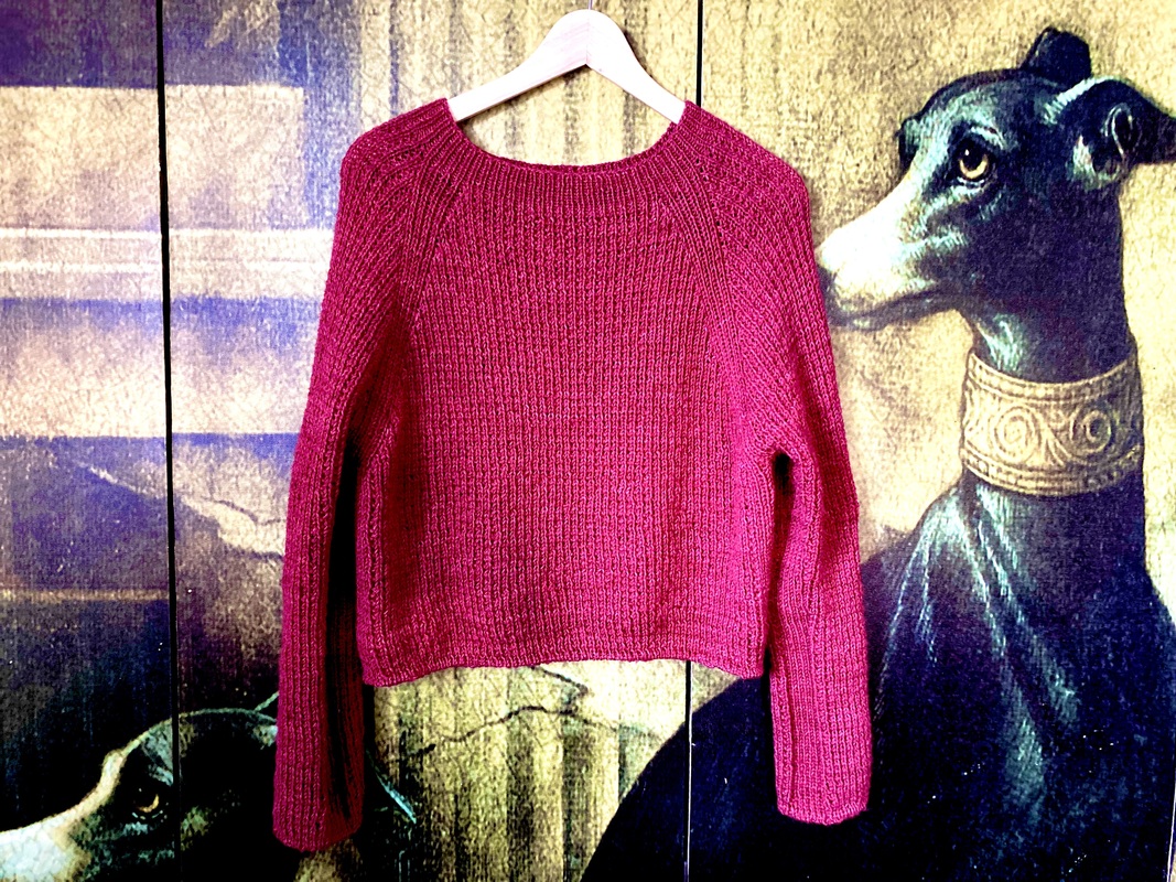 Die Raglanlinien sind etwas länger als üblich, so dass der Sweater insgesamt eine eher weite und bequeme Passform hat und nicht einengt. Der Körper ist relativ kurz, kann aber auch beliebig verlängert werden. Die Ärmel sind weit und werden zum Handgelenk hin etwas schmaler, jedoch nicht eng. Das Design sieht keine verkürzten Reihen im Nacken vor, da diese für die Passform nicht erforderlich sind.