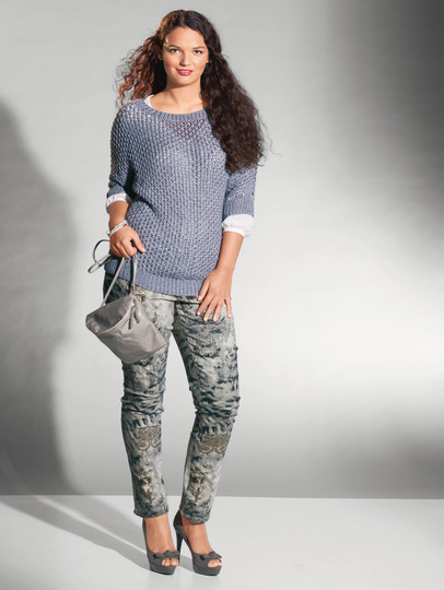 Ein grauer Pulli, der dich lange begleiten wird. Die angeschnittenen dreiviertel langen Ärmel werden gleich mitgestrickt, so dass das Einnähen entfällt. Das transparente Lochmuster hat einen kleinen Rapport und ist schnell gelernt. Bündchen und Halsblende sind im 1/1-Rippenmuster gearbeitet. Ein Viskose-Seide-Mischgarn und das angesagte Grau machen den Pullover zu einem idealen Kombipartner, egal ob zur Jeans in der Freizeit oder zum Kleid oder Rock im Büro. Die Anleitung dazu gibt es zum Downloaden in den Größen 42/44, 46/48, 50/52 und 54/56.
