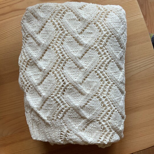 Er hat ungespannt eine Größe von ca. 95 cm (breit) x ca 125 cm (lang), Andere Größen sind ganz einfach möglich, indem man die Anzahl der Rapportwiederholungen in der Höhe oder Breite verändert. Dies sollte man jedoch beim Garnkauf berücksichtigen.