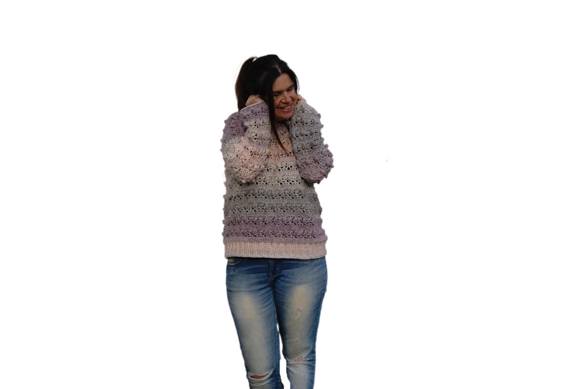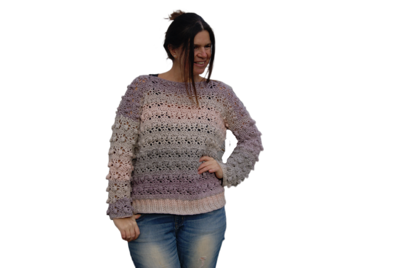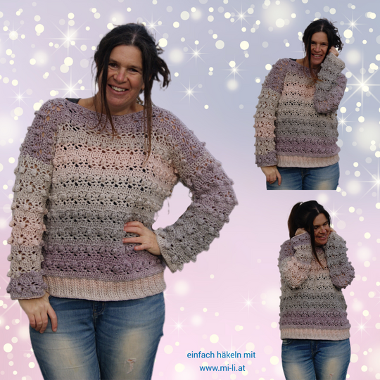 Die Anleitung ist einfach Schritt für Schritt mit Skizzen, Maßen und vielen Fotos erklärt. Auch die Häkelschriften sind darunter jeweils genau Reihe für Reihe bzw. Runde für Runde in Worten niedergeschrieben. Der Pulli ist ganz leicht für alle Größen anzupassen.