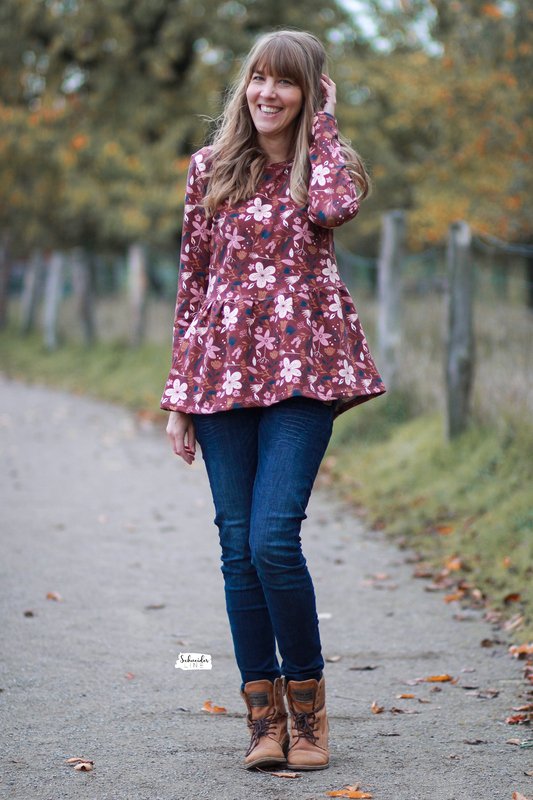 Du kannst den Flouncy Hoodie als Shirt mit Halsbündchen oder Hoodie nähen. Bei den Ärmeln kannst Du zwischen normalen oder Bischofs-Ärmeln wählen. Für die Sommer Version steht Dir eine Kurzarm-Version zur Verfügung.