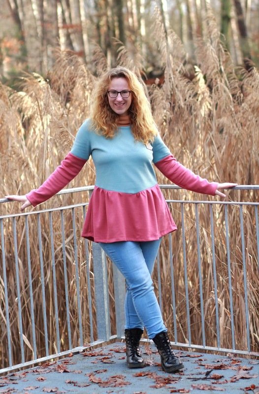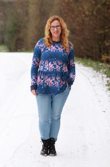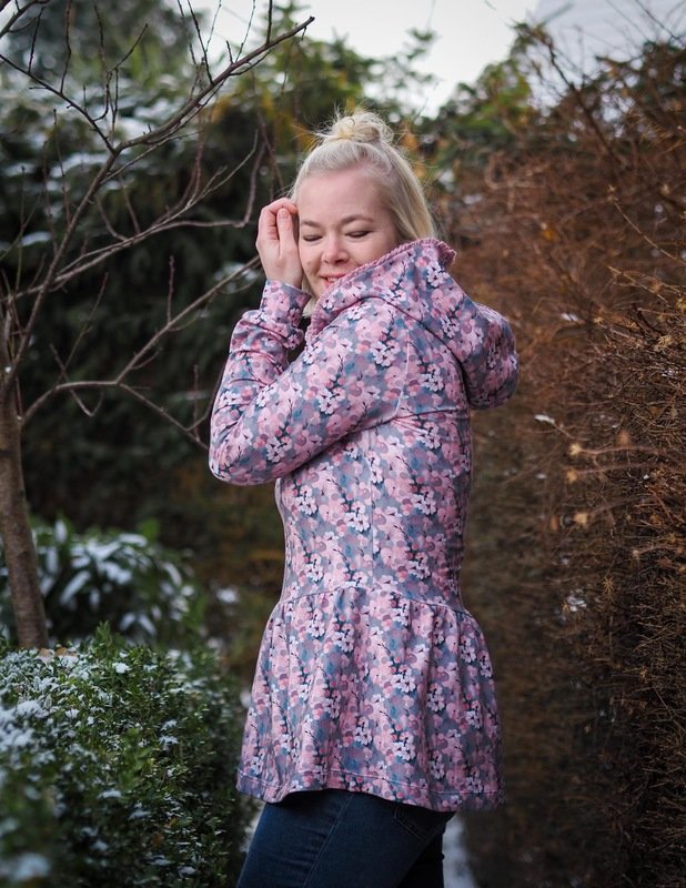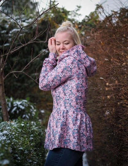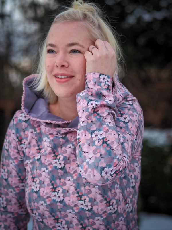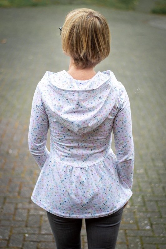 Ausgelegt ist dieser Schnitt auf dehnbare Stoffe wie Jersey und French Terry. Je nach Stoffwahl fällt der Flouncy Hoodie unterschiedlich. Aus Jersey fällt er etwas weicher, aus French Terry hat er etwas mehr Stand.