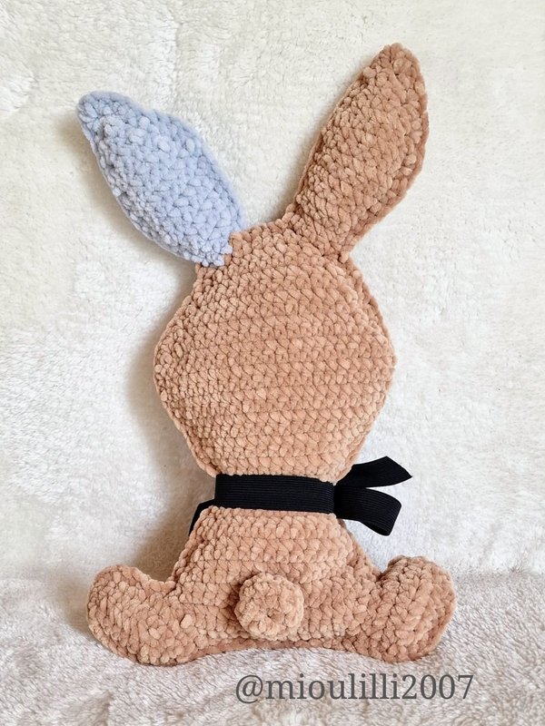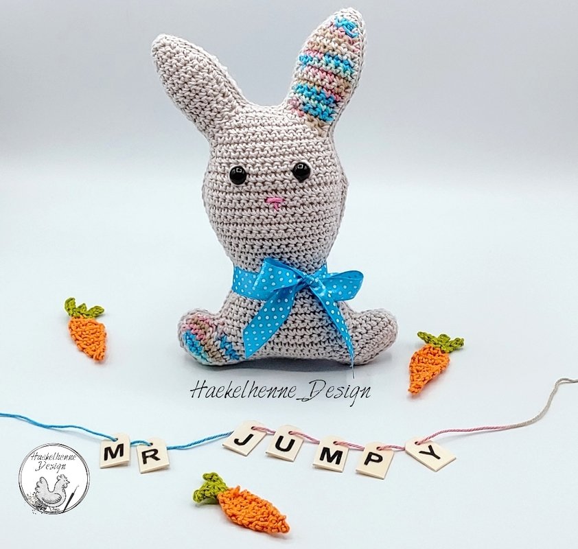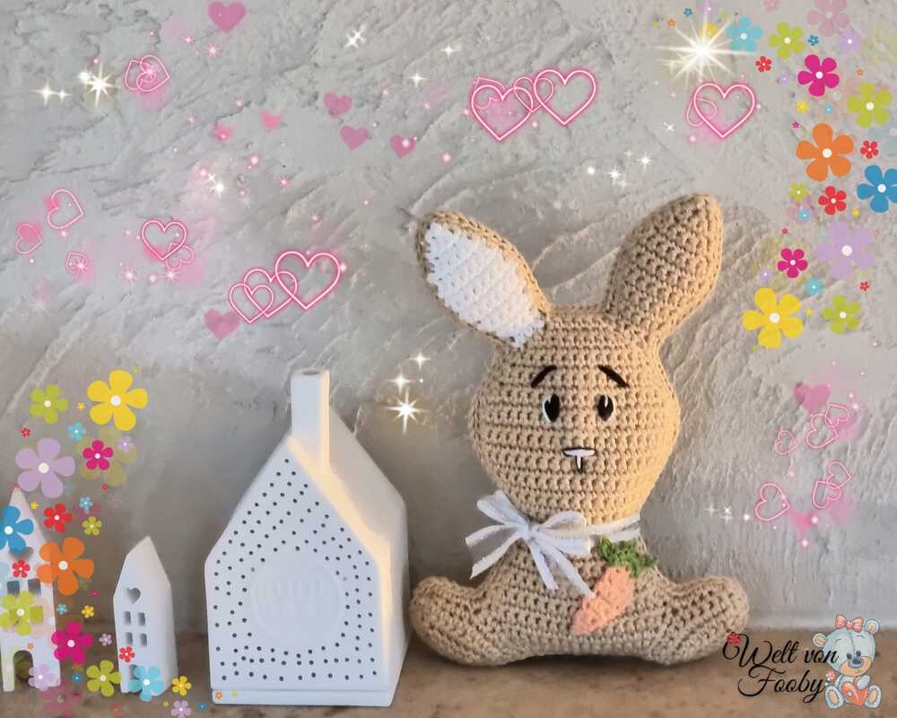 Du kannst den süßen Hasen und sein Möhrchen als Accessoire nacharbeiten. Er eignet sich für die Dekoration an Ostern, ist jedoch auch das ganze Jahr über als niedliche Babyrassel einsetzbar. Die kleine Babyhand kann den Hals des Hasen sehr gut umschließen. Da er aus zwei identischen Seiten besteht, lässt er sich prima zur Applikation verwenden. Er ist auch als Alternative zum Schokohasen im Nest ein süßer Blickfang. Schau dir die schönen Beispielbilder an.