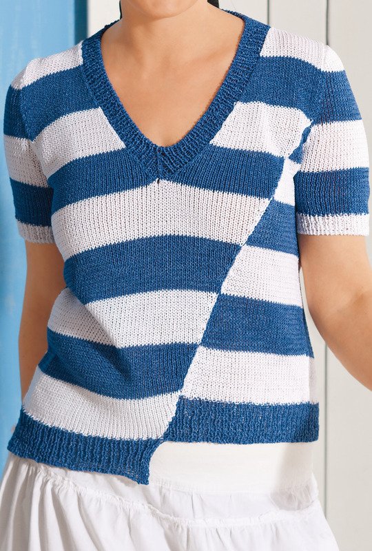 Blau-weiße Streifen im Marinelook müssen nicht immer einfach gleichmäßig verlaufen, wie dieses Modell zeigt. Einfach um eine Streifenreihe versetzt fallen sie modisch aus dem Rahmen. Der tiefe V-Ausschnitt setzt sommerlich gebräunte Haut vorteilhaft in Szene. An den kurzen Ärmeln laufen die Streifen exakt weiter. Wir haben ein leichtes Baumwolle-Viskose-Garn gewählt, weil es an heißen Tagen nichts Besseres gibt. Toll dazu: weiße Hose oder Rock. Eine Anleitung ist zu haben in den Größen 42/44 und 48/50.