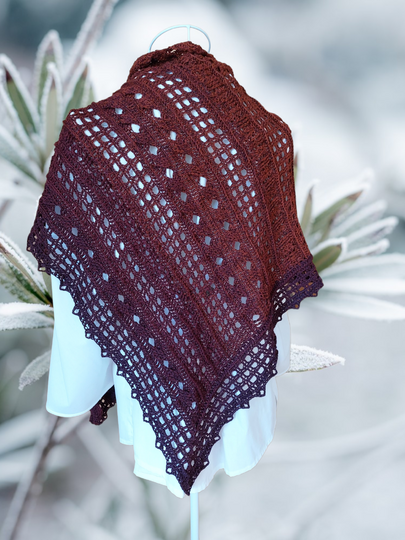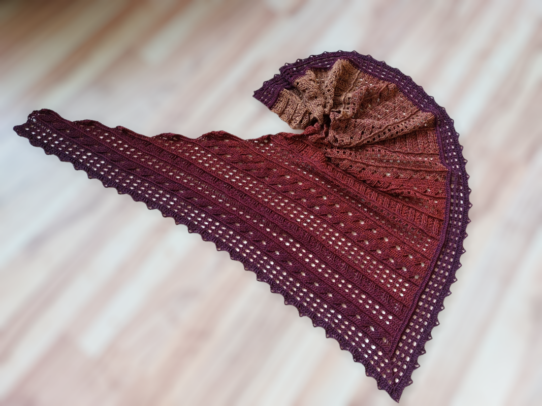 Die Streifen sind am Anfang breit und je länger sie werden, desto schmaler werden auch die Streifen. Im Rand des Tuches findet man wieder das Gittermuster und zarte Zacken bilden den Abschluss. Durch die Zunahmen an der Rundung bekommt das Tuch eine elegante Wellenoptik und es schmiegt sich wunderbar an den Körper.