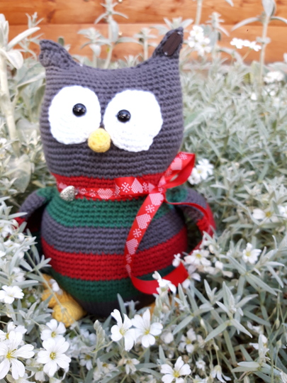 Die fertige Eule wird je nach Wollart und Nadelgröße unterschiedlich groß. In meiner Anleitung mit Nadelstärke 2-2,5 und der entsprechenden Wollart wird die fertige Eule ca. 28-30 cm hoch.
