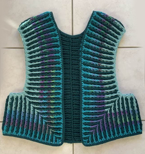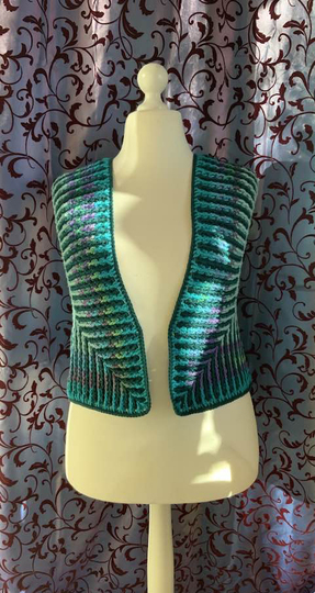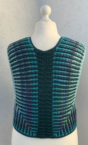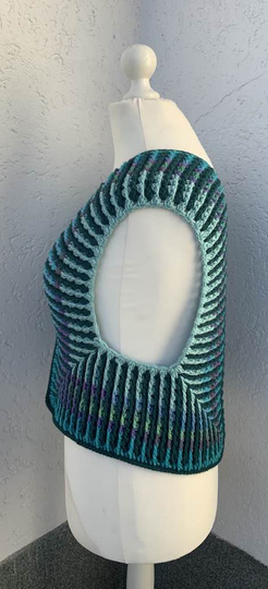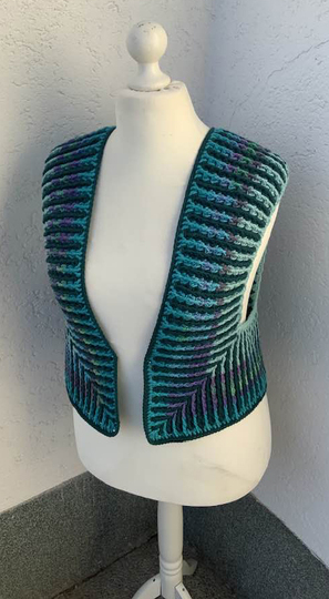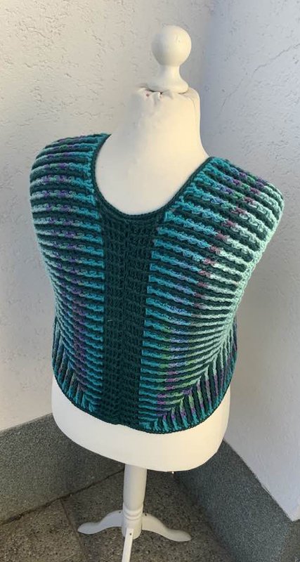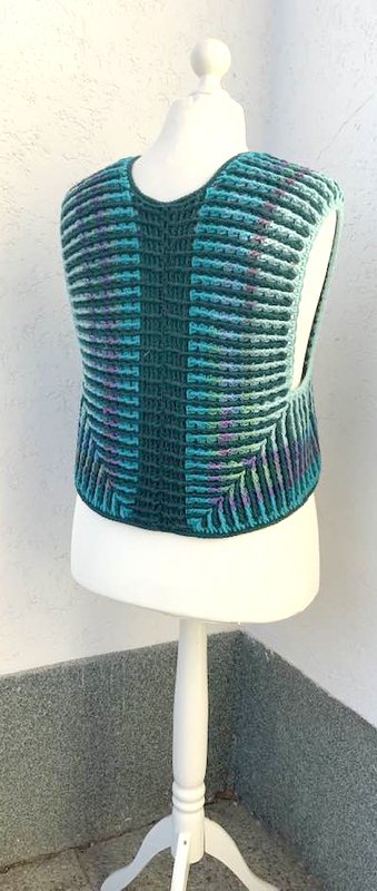 Die Weste trage ich ganz locker, ohne sie vorne zu schließen (natürlich kann man vorne auch einen Verschluss anbringen, wenn man das möchte!) Weste/Bolero INTI ist sehr angenehm, weil auch die Armlöcher sehr groß sind.