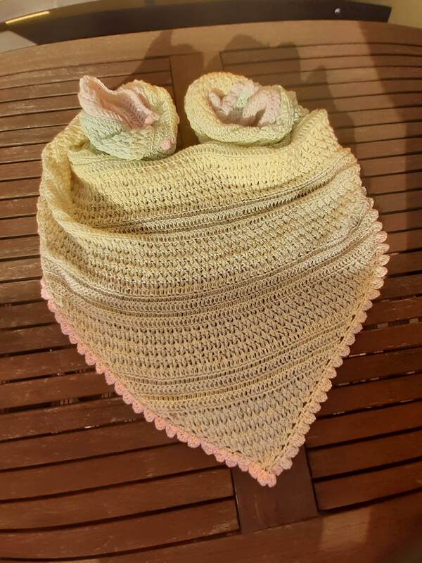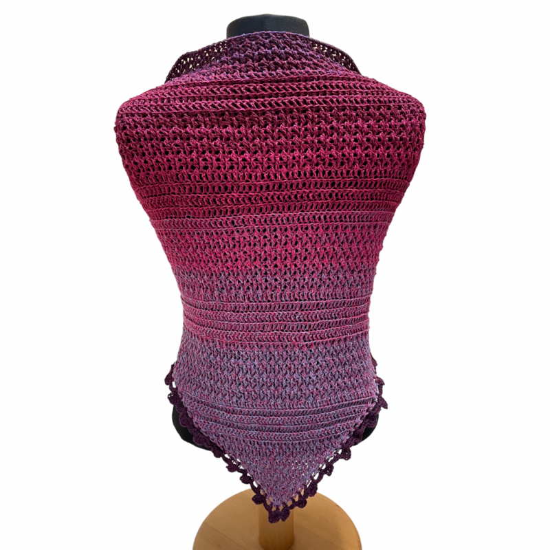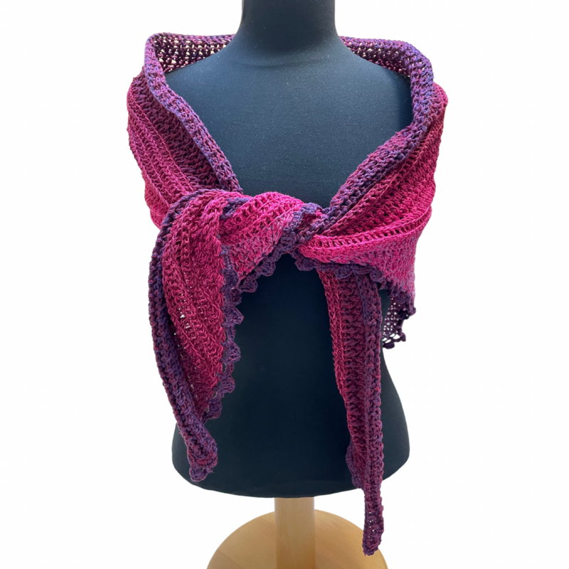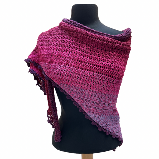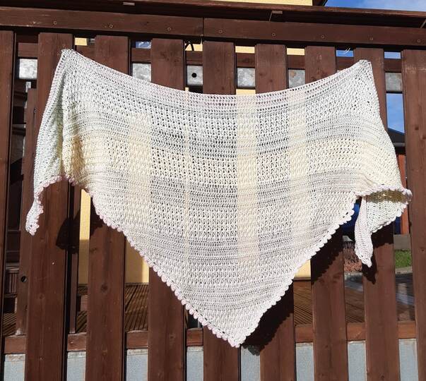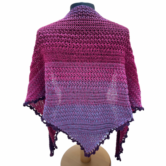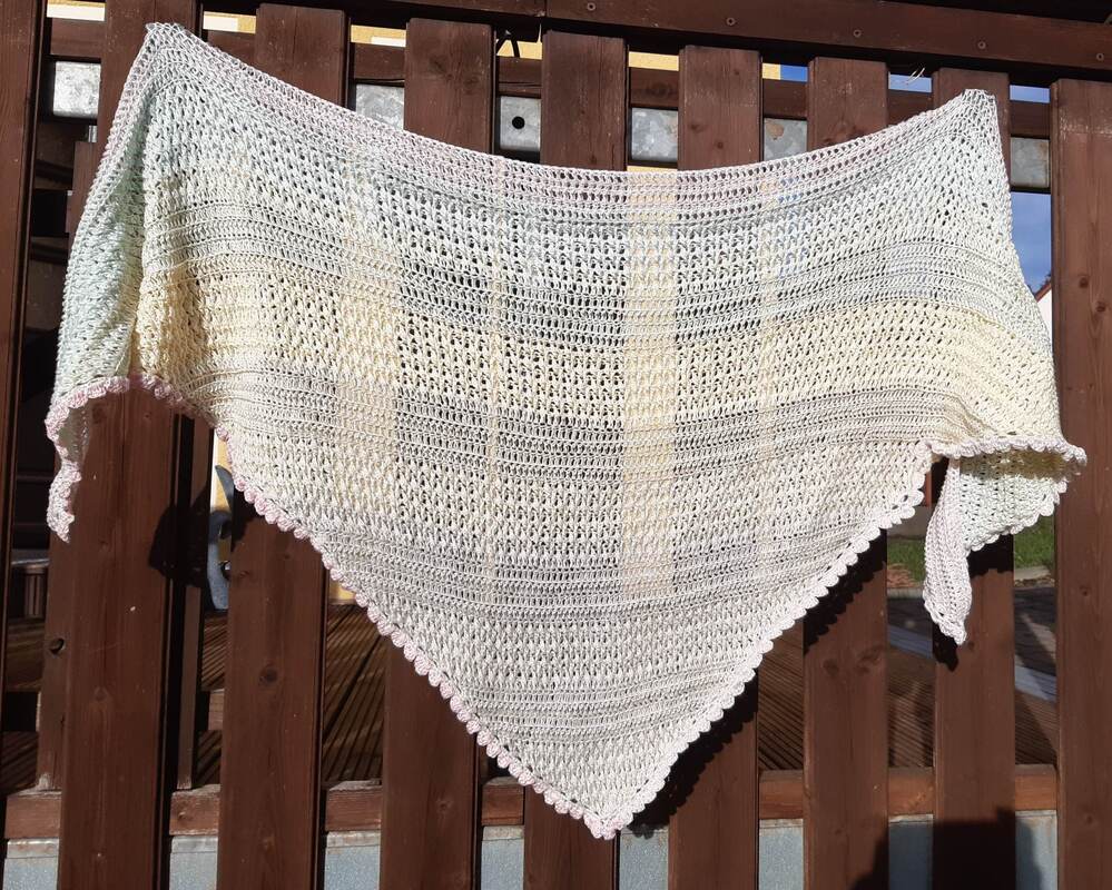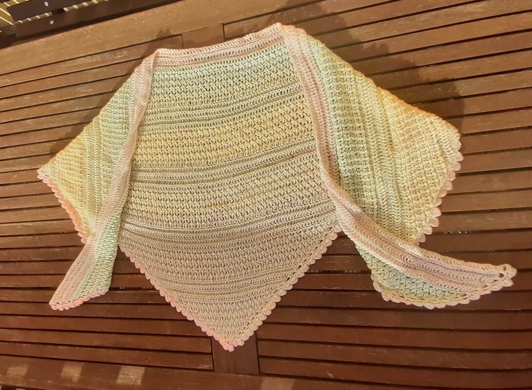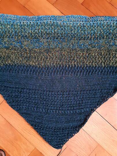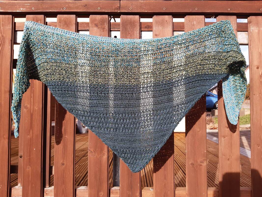 Mein Beispieltuch hat eine Spannweite von 1,65m und eine Tiefe von 0,55m, gehäkelt mit einem 4-fädigen Bobbel (850m) und NS 4.