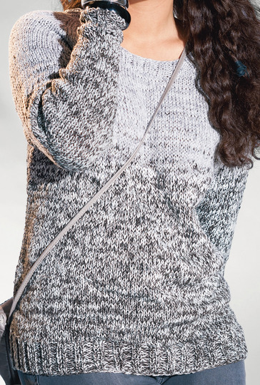 Ein Raglanpulli mit Dip-Dye-Effekt, der durch den schrittweisen Austausch der Fäden von Dunkel- zu Hellgrau entsteht, denn gestrickt wird mit doppeltem Faden. Praktisch dabei: Der Farbverlauf streckt die Figur. Anfängertauglich ist das Muster: glatt rechts, bei dem in unregelmäßigen Abständen eine Reihe im Hebemaschenmuster gearbeitet wird. Ein wenig Erfahrung braucht die Raglanschrägung, nach unserer Anleitung dürfte das aber auch Neulingen gut gelingen. Alle Bündchen werden als 2/2-Rippen gearbeitet. Eine Anleitung steht für die Größe 42/44 zur Verfügung.