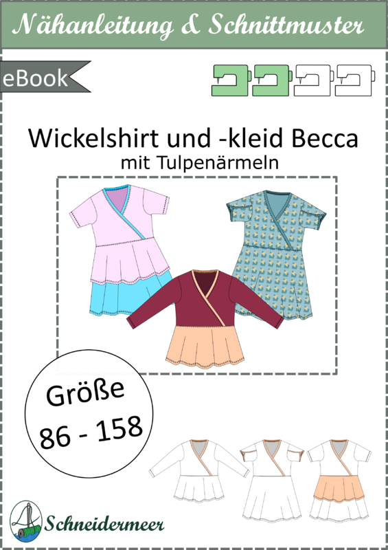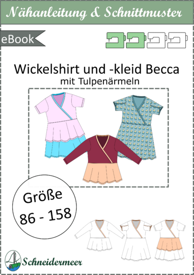 Entdecke das Modell „Becca“ – ein Jerseykleid mit Wickeloberteil und Tulpenärmeln. Das Kleid hat eine A-Linienform, liegt eng am Oberkörper an und fällt locker am Saum. Im Schnittmuster sind neben dem Tulpenärmel auch der einfache, gerade Ärmel in drei Ärmellängen enthalten.