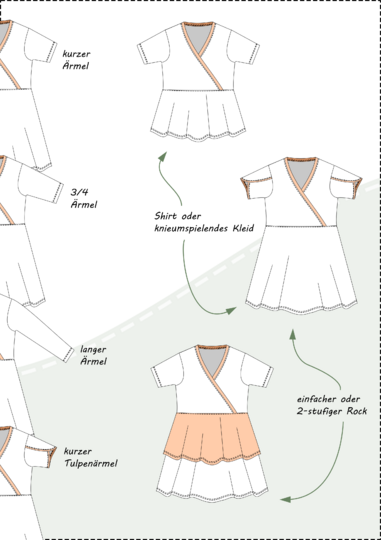 Du hast die Wahl, ob du „Becca“ als Kleid oder als Shirt nähst. Das Kleid ist knieumspielend, der Saum des Shirts ist hüftumspielend. Wahlweise kannst du ein 2-stufiges Kleid nähen.