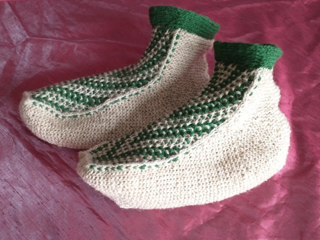 Anleitung für gestrickte Bett oder Hausschuh. Dieses Muster ist für Strickende, die Abwechslung in den Strickanleitungen mögen. Das Mosaikmuster, das zuerst gestickt wird, ist mit in einer Strickschrift beschrieben. Alles andere ist Reihen weise ausgeschrieben.