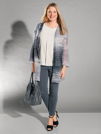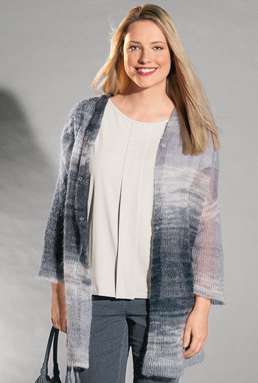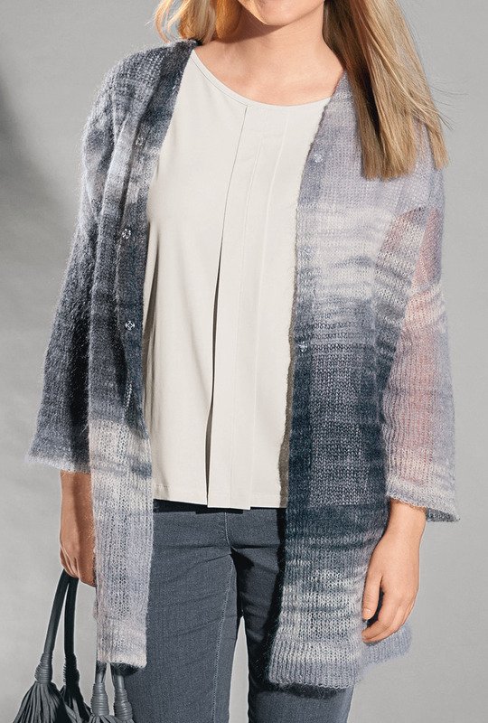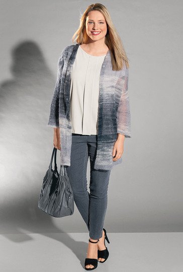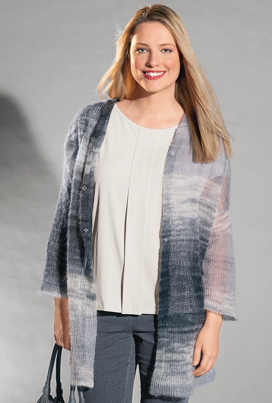 Beim Mantel mit Kapuze kommen die Grauschattierungen direkt aus dem Knäuel des edlen Mischgarns aus Kidmohair und Seide. Dank der Lauflänge von 210 m auf 50 g wiegt dieses Leichtgewicht, je nach Größe, 175 bis 250 g. Die stark abfallenden Schulterschrägungen sorgen für Bequemlichkeit; die bis über die Hüften reichende Länge lässt Hüftpölsterchen verschwinden. Saum- und Ärmelbündchen sind doppelt gelegt. Geschlossen wird der lässige Überwurf durch drei Druckknöpfe, die in die doppelt gelegten Vorderteilkanten geschlagen sind. Die Anleitung kannst du für die Größen 42/44, 46/48, 50/52 und 54/56 downloaden.