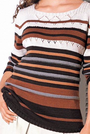 Ein Pulli mit Streifen in unterschiedlicher Breite zusammengesetzt aus verschiedenen Braun-, Beige- und Grautönen. Es scheint als lösen sich die Streifen in ihrer Breite nach oben hin langsam auf und ließen durch die schmalen Ajourmusterstreifen etwas Haut durchblitzen. Für die Bündchen gibt es ein 2-links-1-rechts-Rippenmuster, das auch um den eckigen Halsausschnitt wieder auftaucht. Wir haben für dieses auch businesstaugliche Modell ein Baumwollgarn gewählt. Die Anleitung kannst du dir in den Größen 42/44, 46/48 und 50/52 herunterladen.