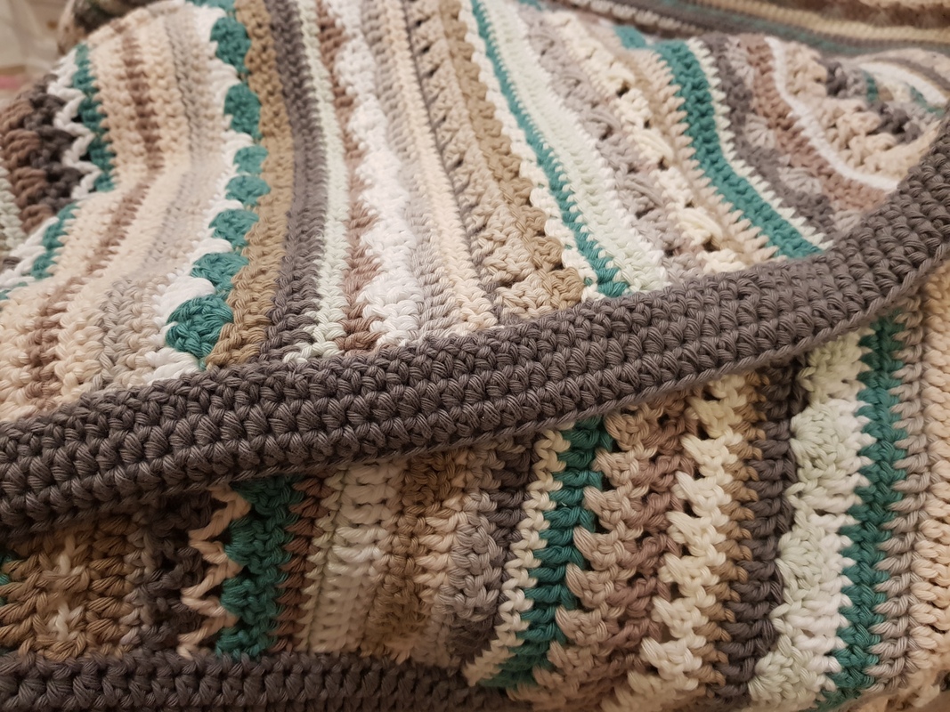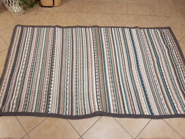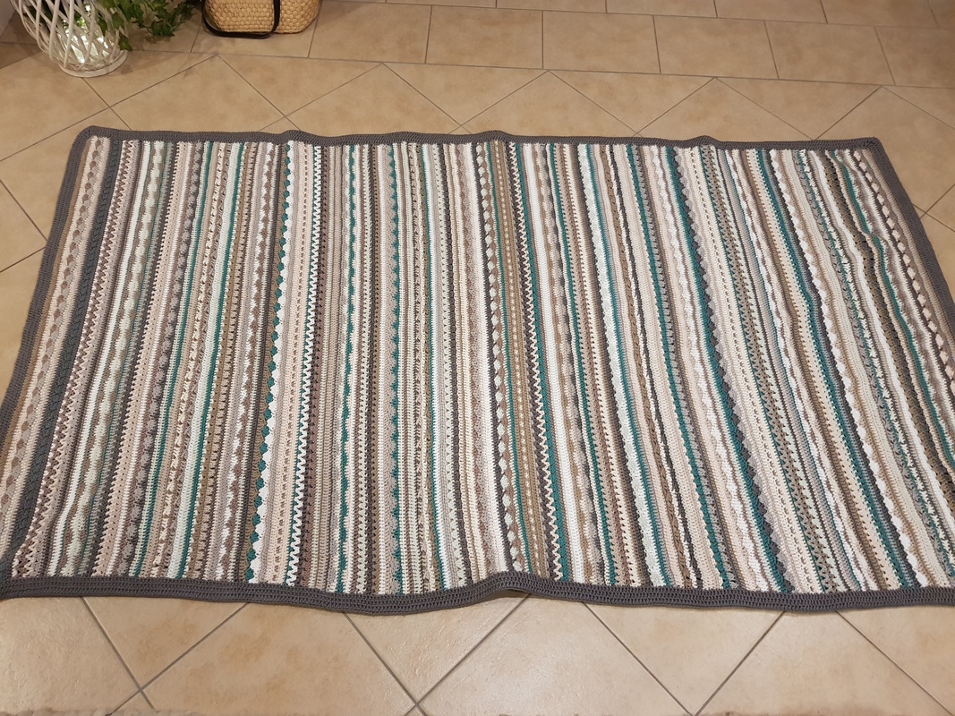 Die Decke vom Titelbild wurde mit 46 x 8/8 Baumwollgarn mit jeweils 75m gehäkelt, für die Umrandung habe ich nochmal 6 Knäule gebraucht. Sie und hat eine Größe von 105 x 190 cm.