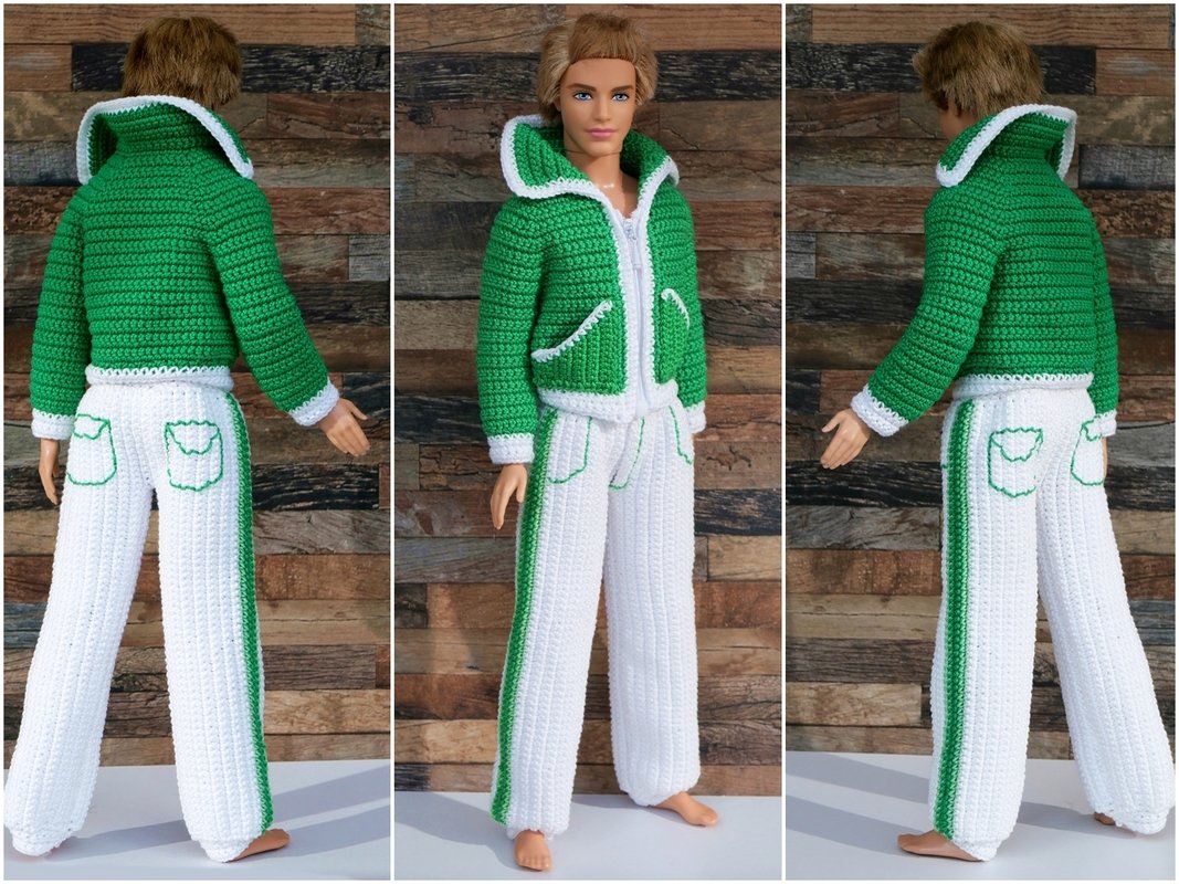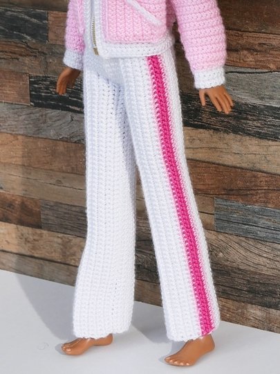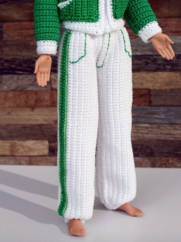 Zu dieser eher sportlichen Jacke passen am besten Hosen. Für die Herren häkeln wir eine sportliche Jogginghose und für die Damen eine figurnah sitzende Schlaghose mit Bügelfalte. Wir häkeln die Hosen in einem Stück, so dass wir keine Nähte haben. Die Hosen haben seitlich einen modernen farbigen Gallonstreifen. Hier kann man die Farben der Jacke aufgreifen. Die Hosen werden im Bund mit einem Druckknopf geschlossen.